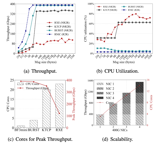 近日,我院陈果教授团队提出了BURST——一个面向异构环境的高性能Soft-RDMA栈。通过基于用户态的设计、安全可靠的共享资源管理机制,以及结合DPDK与DSA的高效加速,BURST实现了与商用RNIC行为和性能基本一致的RoCEv2通信流程,并在400G环境下首次证明:软件RDMA也可以以较低的CPU开销,实现接近硬件线速的吞吐,并显著提升NR2R场景的连接建立效率与通信性能,为RDMA在异构集群中的大规模落地提供了可行路径。